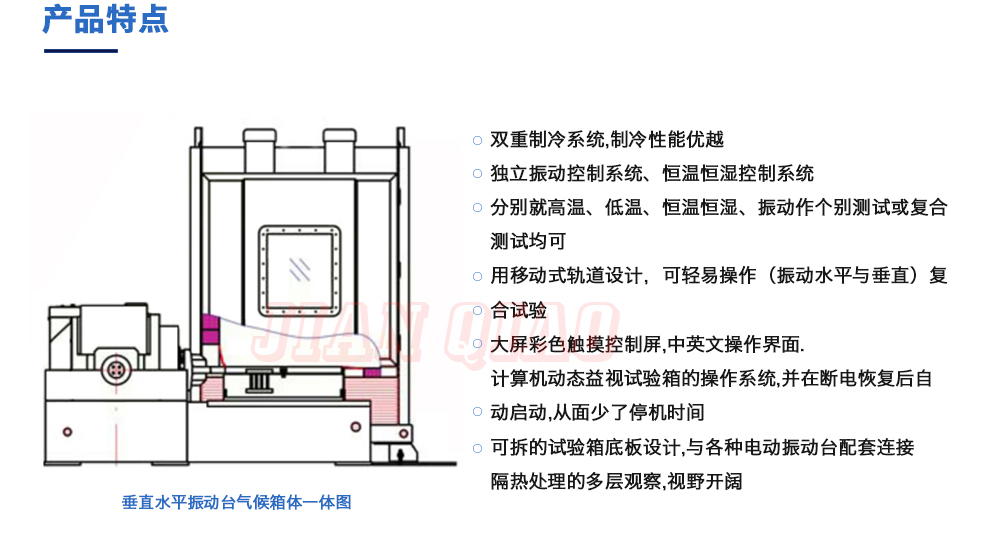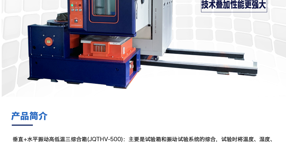 用途:垂直+水平振動高低溫三綜合箱(JQTHV-500):主要是試驗箱和振動試驗系統(tǒng)的綜合,試驗時將溫度、濕度、振動(高溫或低溫),(正弦振動或隨機振動)以及電應力按規(guī)定的周期綜合在同一氣候試驗箱中施加到樣品上進行溫度、濕度、振動的“環(huán)境仿真”試驗。